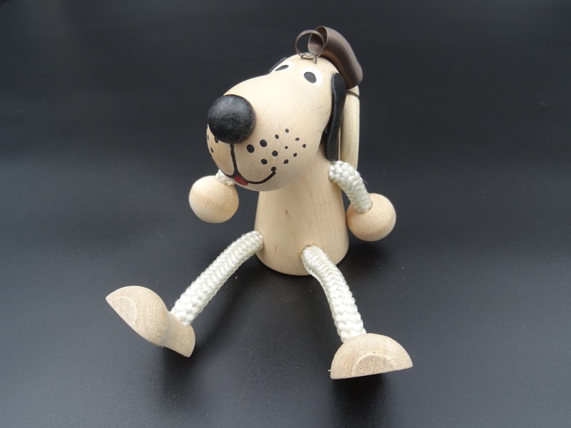 Собака изготовлена из натуральной березы. Вытягивание шнура перемещает тело вправо и влево, и собака виляет хвостом.